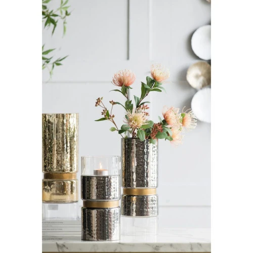 Create an elegant ambiance anywhere with this small vintage style candle holders. It features a glossy, hammered finish with a dramatic effect to make a bold decorative. This piece makes a radiant addition to a dining room table, master bathroom, or living room.