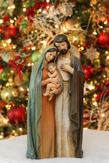 Features inspirational figure of Mary, Joseph and baby Jesus