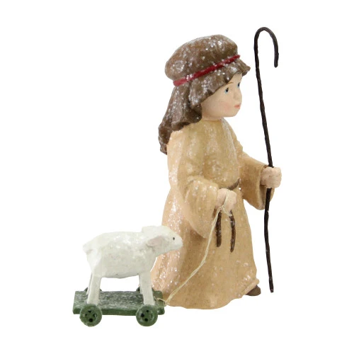He pulls along his white lamb on a green cart while also keeping hold of her staff