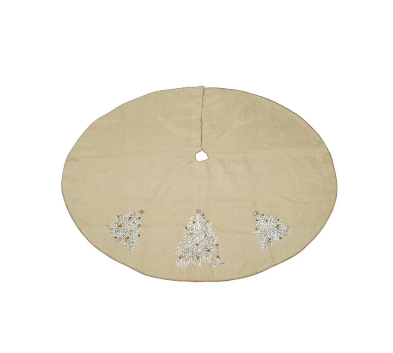 Metallic gold and beige body with white and silver ribbon embroidered Christmas trees