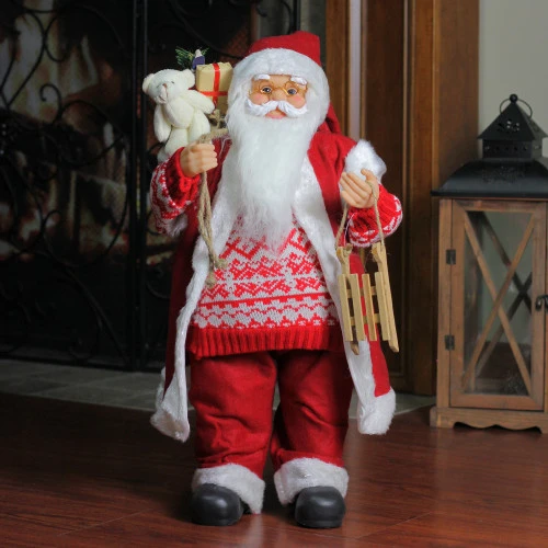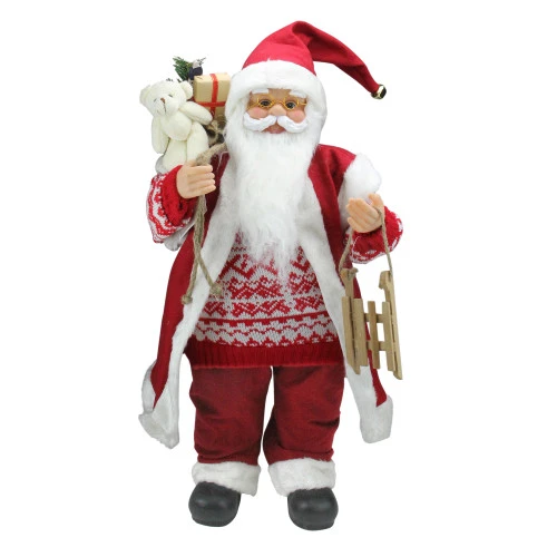 This Santa is dressed in his traditional outfit with a little twist, a knitted fair isle sweater and his fur trimmed sleeveless vest. In one hand Santa holds a wooden snow sled that and a burlap gift bag filled with various Christmas items in the other hand. Place him anywhere in your home this holiday season for a festive touch.