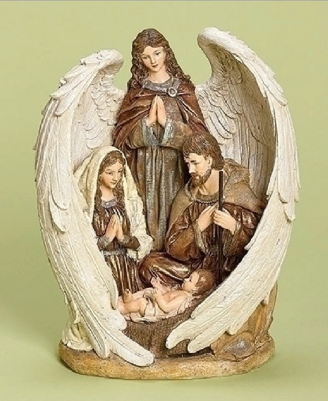 Mary and Joseph look lovingly upon the newborn baby Jesus